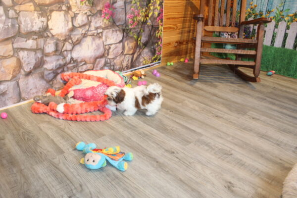 Ollie is such a cute little boy at 8 weeks and 4 days old. I took these pictures today on 4/12/26. This age/stage is such a fun stage for little Shih-tzu puppies. They love to go at top speed and then crash for a couple of hours for a nap and then recharge and go again.. Plus they love the little toys. They still sleep alot at this age.